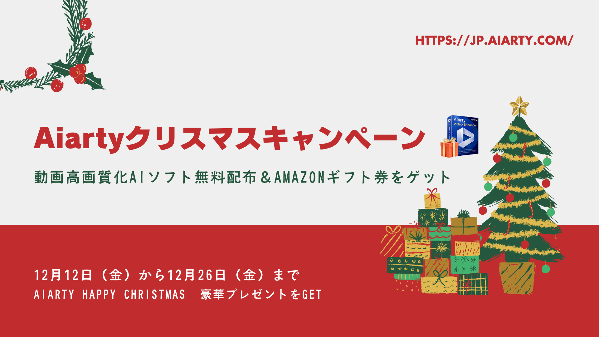 開催期間は2025年12月12日(金)から12月26日(金)までの2週間。特設ページは「Aiarty Happy Christmas 2025 豪華プレゼントキャンペーン」と銘打たれ、以下のURLからアクセスできます: