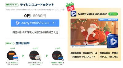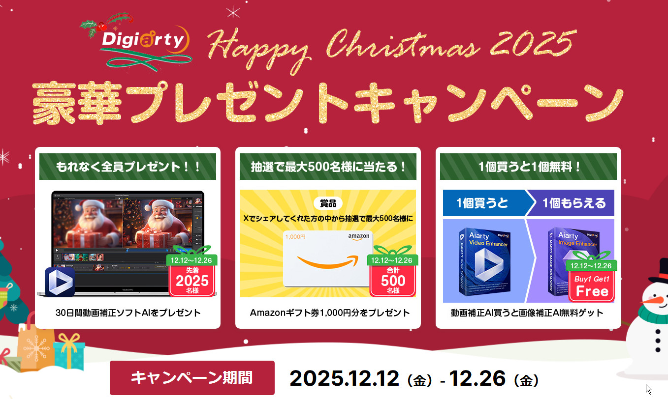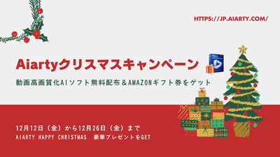 今年のクリスマス、AI動画補正ソフトの「Aiarty Video Enhancer 」が先着2,025名に無料で提供されています。さらに、Amazonギフト券の当たるシェアキャンペーンも実施中で、総数は最大500名にのぼります。