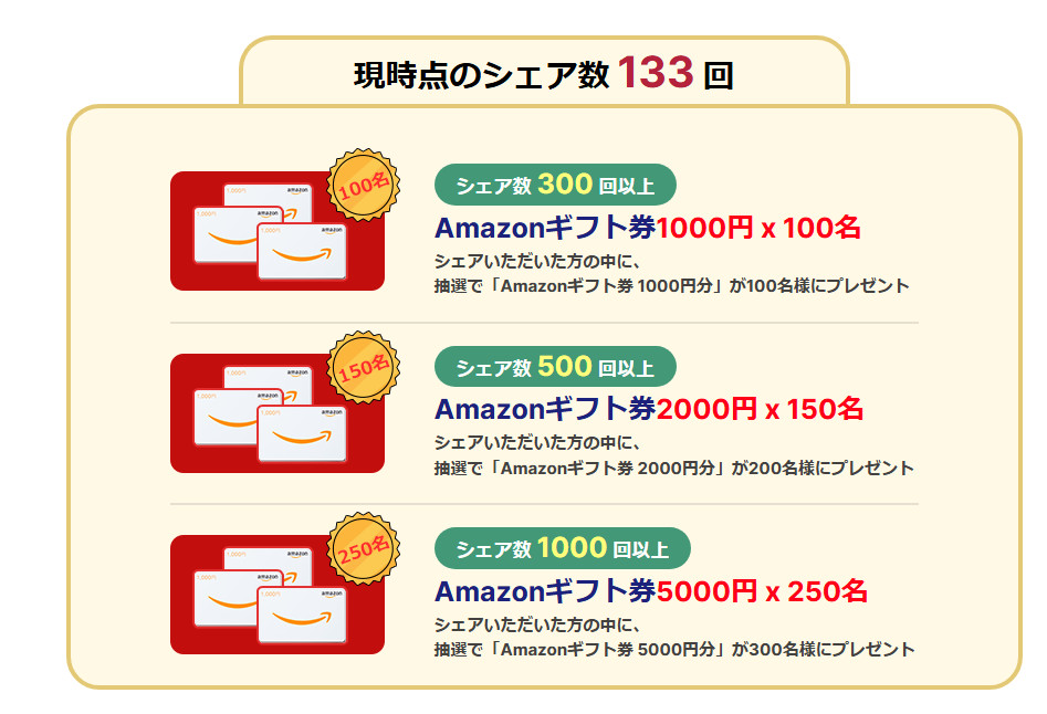 キャンペーンページをX(旧Twitter)でシェア(リポスト)すると、抽選でAmazonギフト券が当たります。特徴的なのは「シェア数に応じて賞品が豪華になるステップアップ方式」で、具体的には以下の通りです: