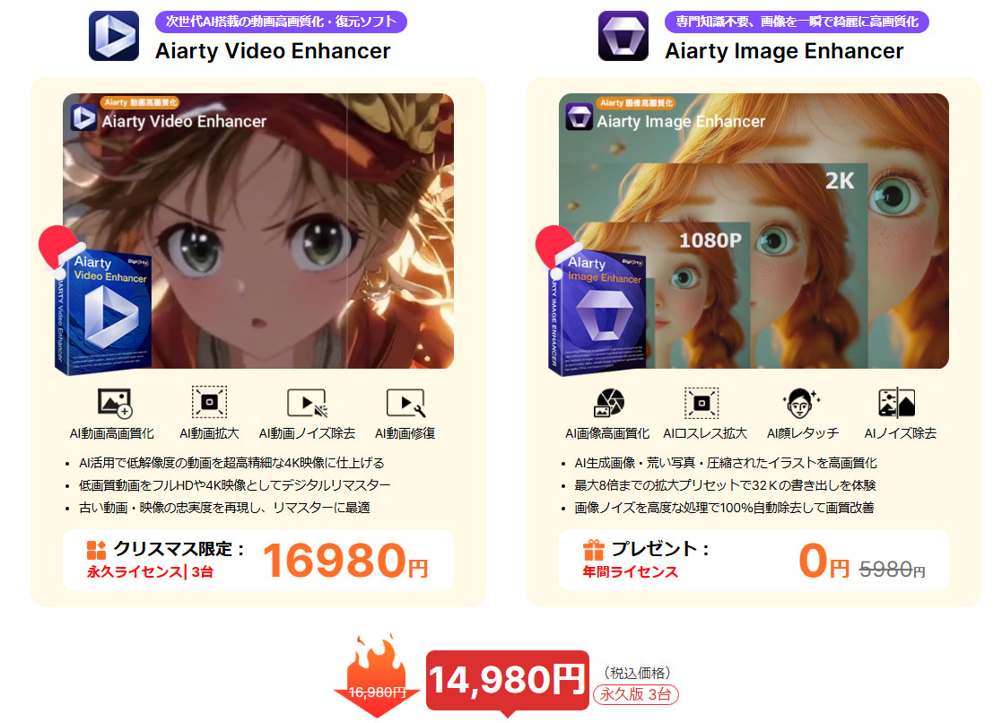 この期間中に「Aiarty Video Enhancer (動画補正)」を購入すると、「Aiarty Image Enhancer (画像補正)」の年間ライセンス(5,980円相当)が無料でプレゼントされます。動画と写真の両方をAIで美しくしたい方には最適なセットです。